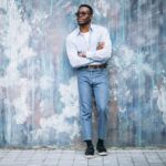 - For a smart and sophisticated look, you can wear a brown v-neck t-shirt with navy chinos, a gray blazer, and brown loafers. You can accessorize with a leather belt and a watch.